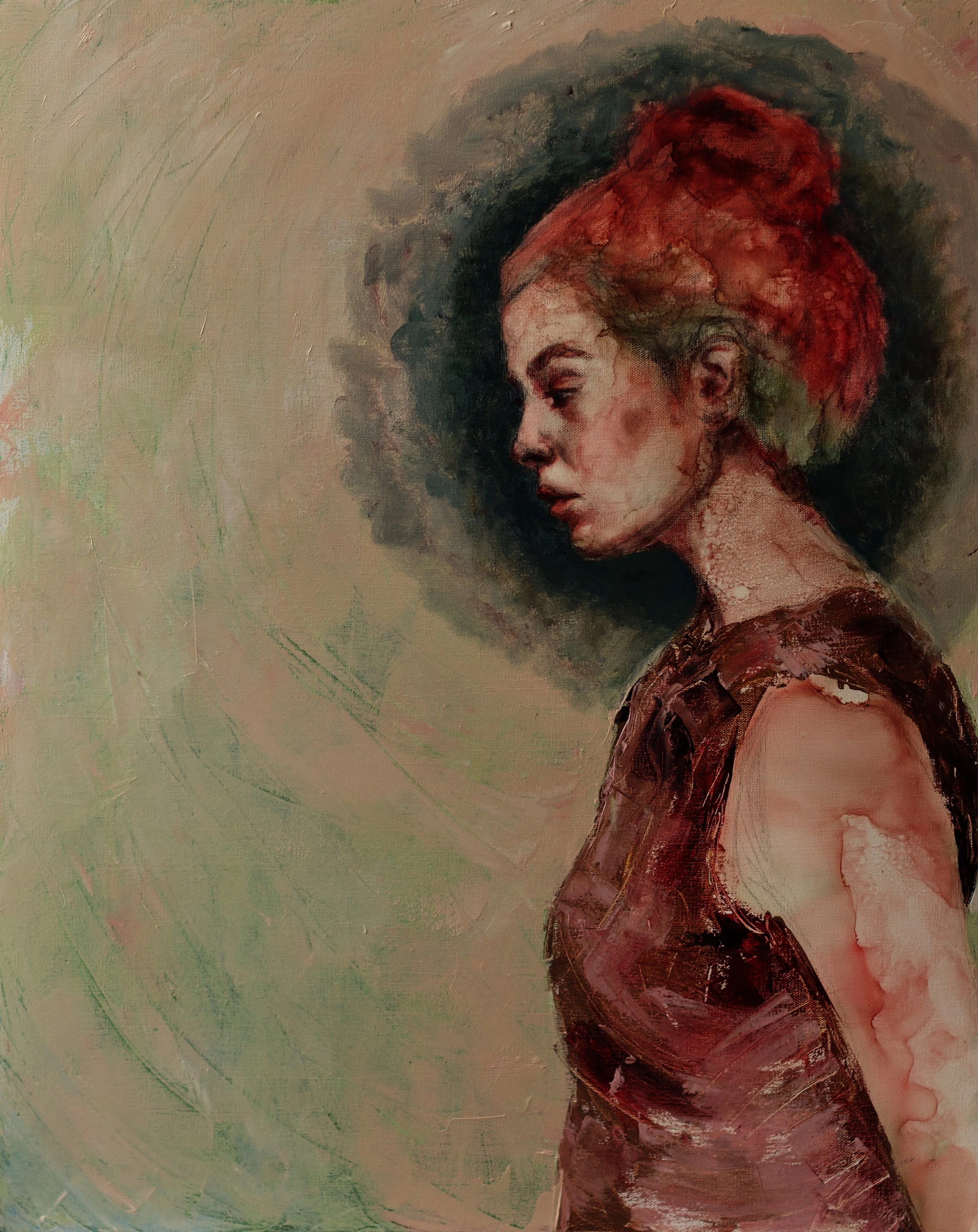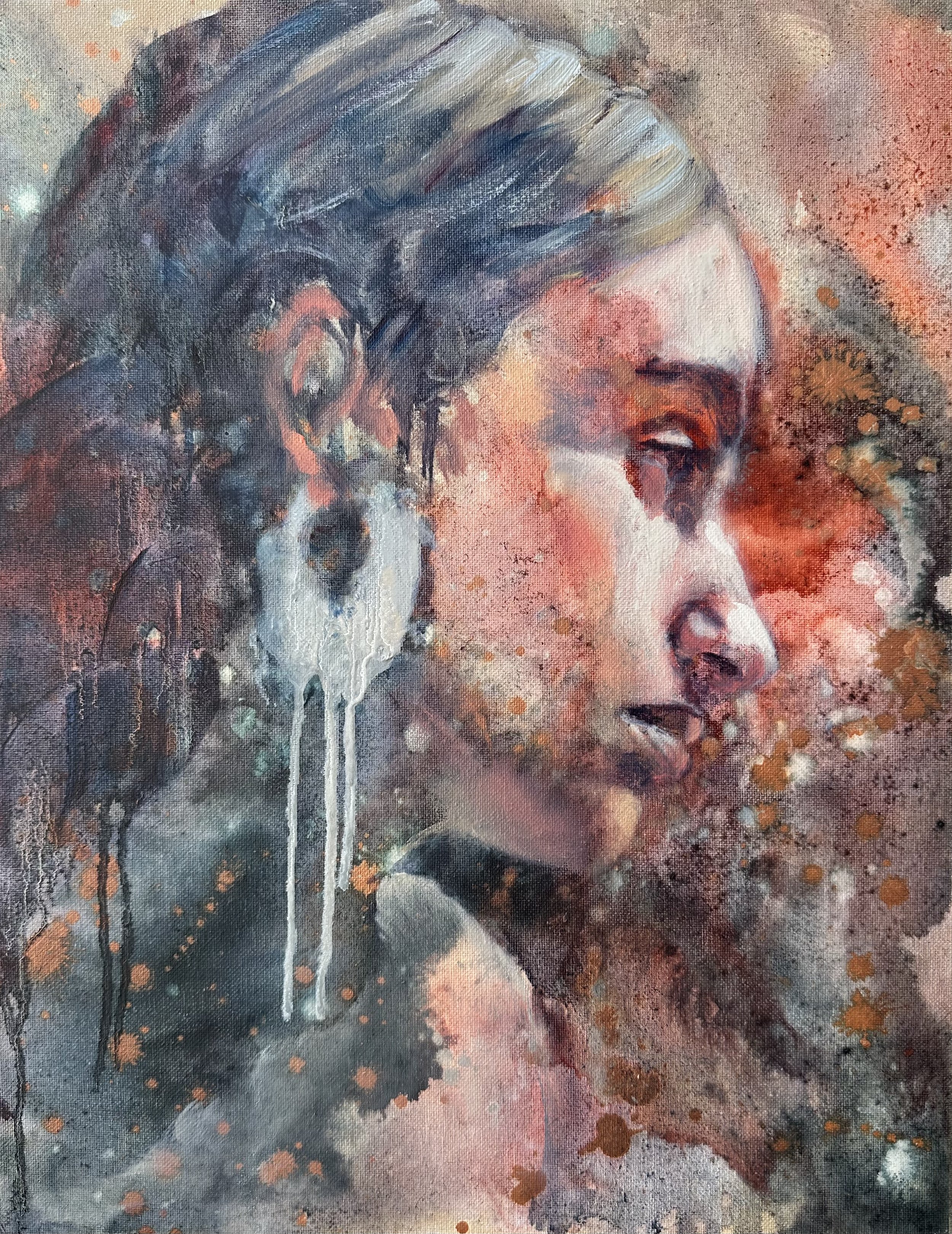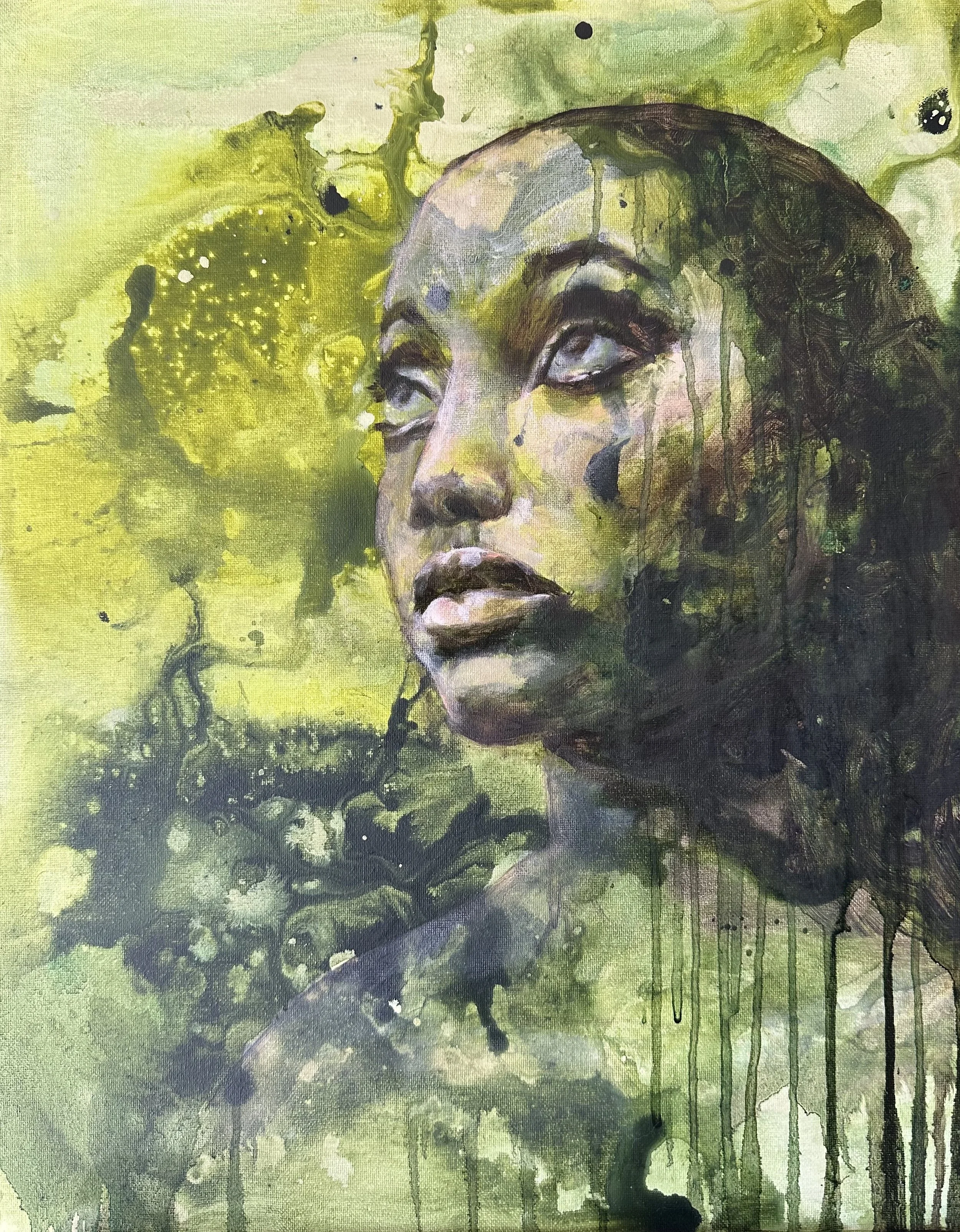 Justine paints abstracted figurative paintings that explore what it means to be fully alive, the journey from fragmented living to wholeness. Through layered, intuitive processes using fluid mediums like ink and water alongside oils and acrylics, she lets intuition lead, creating pieces where vivid scenes and backgrounds move through human faces and figures. Her work explores both the pain of disconnection and the potential for full human emotion, challenging dehumanizing narratives through honest storytelling.